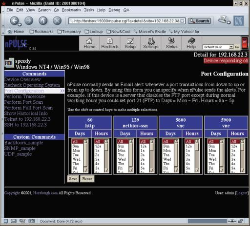 You'll be asked where you want nPULSE installed (the default is /usr/local/npulse) and a handful of other questions, including one about your personal architecture. Because nPULSE is multiplatform, you need to specify what you are running it on. I chose Red Hat 7 when I did this, but you'll see support there for every major Linux distribution, as well as for SCO, Solaris, SGI and number of others. The final set of questions asks you to choose an administrator login and password for security authentication. Once that is done, nPULSE's web server is started on port 19000 (although you can change that as well). Point your favorite browser to http://your_server:19000/ to connect to the server.