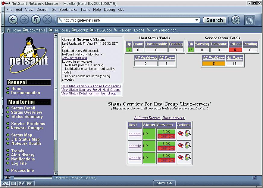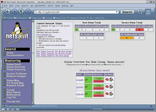 If all has gone smoothly, we should be able to connect to NetSaint through our browsers. No special port numbers here. Assuming a system called my_system, you would use the URL http://my_system/netsaint/. For a peek at our NetSaint in action, I invite you to sample Figure 2.