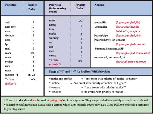 Table 1 summarizes syslog.conf syntax, facility values, severity values and action types. Note that the three main columns of this table are independent; there's no correlation between facilities, severities and actions, i.e., a message may be sent to any facility with any severity and have any allowed action performed on it. Note also that the numeric facility and severity codes are provided strictly for reference; you should not use these in syslog.conf, but you may come across them in source code or in a packet-dump of network traffic.