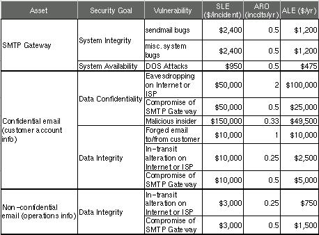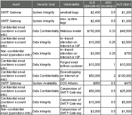 Figure 2 shows a more complete threat analysis for our hypothetical business' SMTP gateway, including not only the ALE we just calculated but also a number of others that address related assets, plus a variety of security goals.