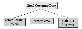 To create an attack tree, you must first define the root node. For example, one attack objective might be “steal Mommenpop, Inc.'s customers' account data”. Direct means of achieving this could be 1) obtain backup tapes from Mommenpop's fileserver, 2) intercept e-mail between Mommenpop, Inc. and their customers and 3) compromise Mommenpop's fileserver over the Internet. These three subgoals are the leaf nodes immediately below our root node (Figure 4).