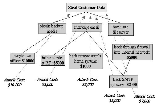We see in this example that backup media are obtained most probably by breaking into the office; compromising the internal fileserver involves hacking in through a firewall, and there are three different avenues to obtain the data via intercepted e-mail. We also see that while compromising Mommenpop, Inc.'s SMTP server is the best way to attack the firewall, a more direct route would simply be to read e-mail passing through the compromised gateway.