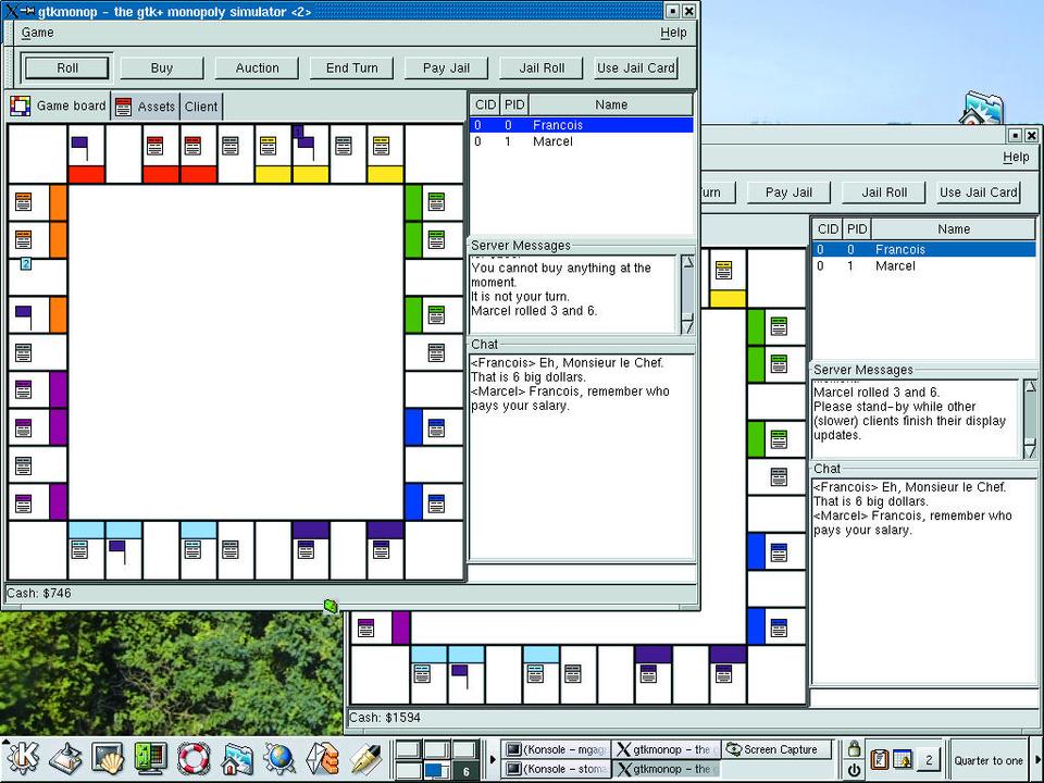 As with the previous item on tonight's menu, Batalla Naval, gtkmonop provides a chat window so that you may (ahem) chat with your game partner or partners. Have a look at Figure 2 for a screenshot of a gtkmonop game in action.