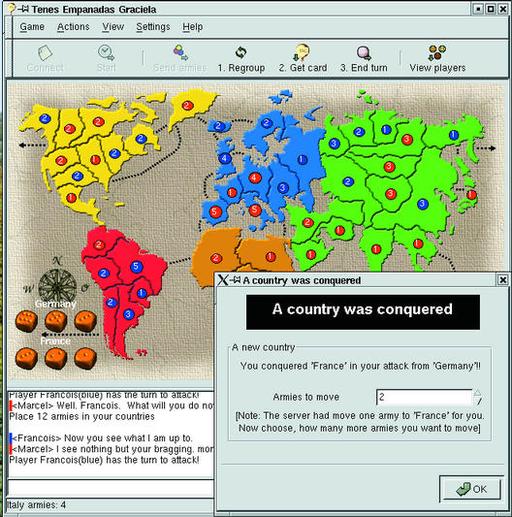 In the Linux world, we sometimes joke about world domination, meaning (of course) Linux's domination of the server world, the desktop, the PDA and so on. It seems that for some of us, this obsession goes back to the days before Linux was born. Many years ago I whiled away a great deal of time with friends playing a little friendly game of “conquer the world”. I do not need to tell you the risk in such an enterprise. That, by the way, was also the game's name: Risk. I occasionally miss those days, but now I need no longer fear because our old friend, Ricardo Quesada, decided that he too missed those days. Ricardo is the author of Tenes Empanadas Graciela (or just plain TEG). Along with his dedicated band of developers and gamers, the classic world conquest board game lives.