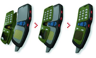 Physically, the GITWiT phone consists of two pieces (see photo). The GITWiT-enabled handset contains the core telephony functionality. A software-enabled cover, called a Smart Skin, snaps onto the handset core to define a specific and easily alterable look, feel and wireless-user experience.