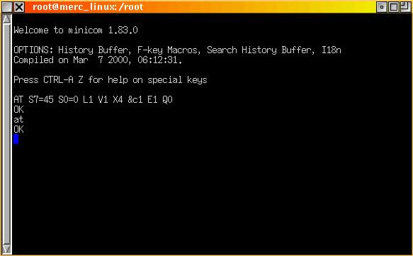 Now minicom is using the device /dev/modem. Type at. You should receive an OK response (see Figure 2). If that is the case, congratulations!