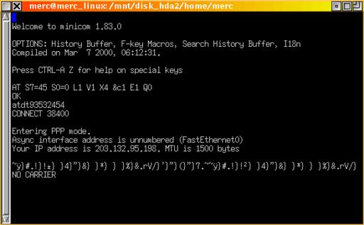 It is very important to remember that from now on the modem is going to stop responding to any at commands; all the information sent to the serial port will be modulated and sent to the other side of the line. At the same time, all the information coming from the other side of the line will be demodulated and sent to the serial port (hence, the word modem). The computer (or, better, the serial port) is not aware of all this. It runs exactly as if there was a serial cable running from your computer to the computer on the other side. In fact, if you have two PCs at home, you can network them together quite easily using pppd and connecting their serial ports with a serial cable (you have to make sure it's an inverted cable so that the send pin of the first computer is connected to the receive pin of the second computer, and vice versa).