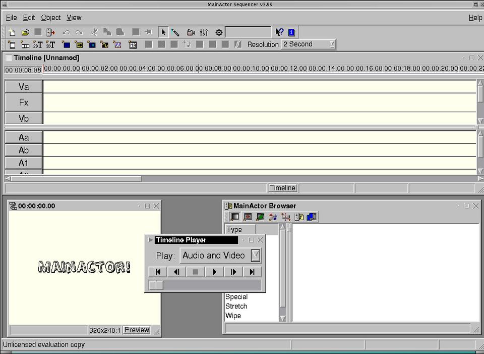 MainActor can title (2-D and 3-D text) and edit movies. It offers video transitions and audio effects. The evaluation version writes “MainActor” on your video until you purchase a registered copy. MainActor includes the following programs: maseq (NLE), mave (animation converter), macap (V4L MJPEG capture) and lmatool (console video file converter). The documentation is in /usr/share/doc/Packages/MainActor.