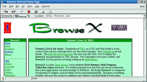 BrowseX-1.5.0 is one of the most unique browsers tested; it is written in a combination of Tcl and C, making it resource-light. It contains its own mail and talk/chat clients, supports HTML 3.2 and handles graphics, secure web sites and JavaScript. Another unique feature of this browser is that it implements the TML extension, which provides an embedded web-scripting interface to Tcl, Perl and Python. BrowseX also can import existing Netscape bookmarks by selecting Import Netscape Bookmarks from the File®Util menu.