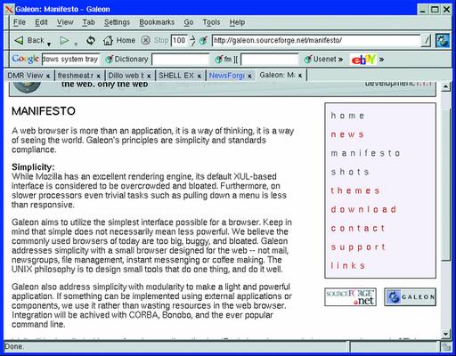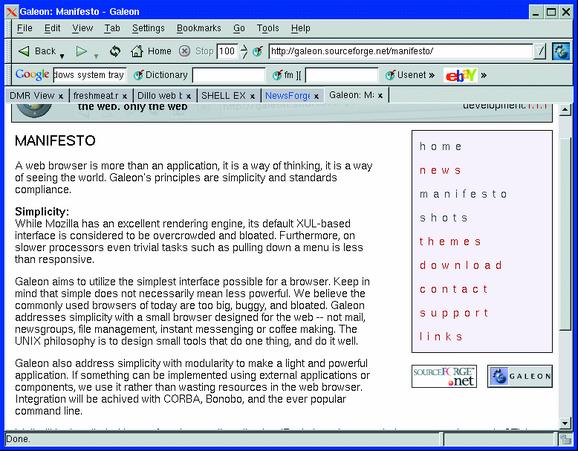 Galeon's motto is “The web, only the web”, and Galeon is meant to be only a web browser, not an all-in-one web tool. It is based on Mozilla code and requires Mozilla to be installed before it can be used. This was one of the first Mozilla-based browsers, and its maturity shows in the features provided. One such feature is the Smart Bookmarks, which have their own toolbar and allow the user to do things such as search Freshmeat II, Google and Google's news archive. Another nice feature is the Settings menu on the top menubar that allows easy access to such settings as proxies, animation control and JavaScript.