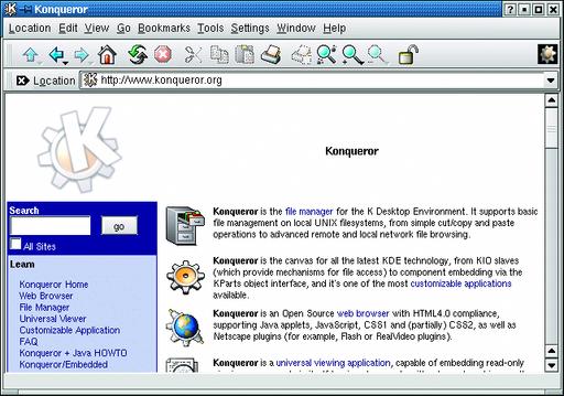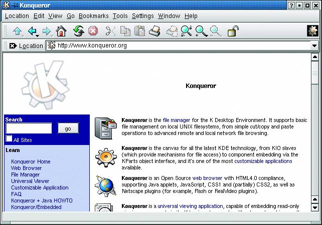 Konqueror is KDE's filesystem/web browser application and is not based upon Mozilla. The browser has unique features, including the ability to split the window into panes, with each pane displaying different web sites or even a web site and the contents of a local directory. Konqueror allows Java, JavaScript and browser identification to be controlled on a site-by-site basis. Finally, a toolbar button (a black button with a white X) is provided to conveniently clear the location text box.