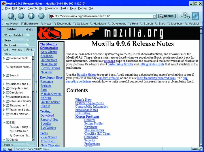 Mozilla is the browser that was open sourced by Netscape back in 1998. It does not have lightweight as a design goal, and the browser's sluggishness can be quite noticeable. According to its web site, work is being done to speed up the code, and each new version does seem faster than the previous one. It does support some notable features, such as a sidebar that contains bookmarks and search results and the ability to switch themes. It was also one of the few browsers that could successfully print a range of pages, but it failed at printing the last page first.
