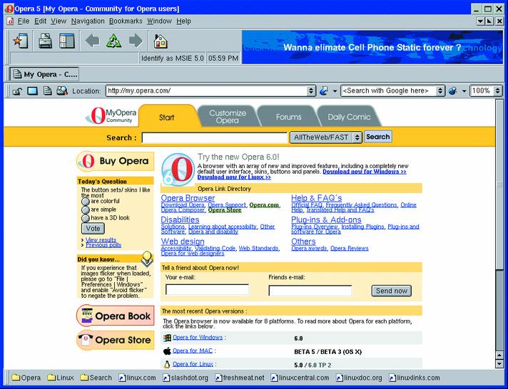 Opera shows maturity in its interface and capabilities, but there are some things to watch out for. One large bug that cropped up was it occasionally wouldn't erase the old page and display a new web page, even though it insisted that it had finished loading it. This happened frequently with Freshmeat (freshmeat.com), and the only fix was to load the requested page again. There were also problems with printing; printing in landscape orientation produced no output, and the browser prints in color even if grayscale is selected. Opera 5.0 doesn't support Java or plugins, but the Opera 6 Technology Preview notes indicate that these items are available in version 6.