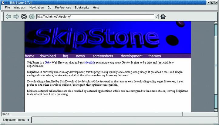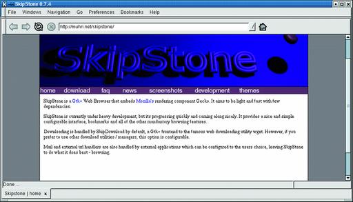 Also built on Mozilla, SkipStone is younger than Galeon and sports a sparser, though functional, interface. This browser still has some quirks, such as there is no way to browse local directories using the File®Open menu and there are no location histories for the Forward and Back arrows.