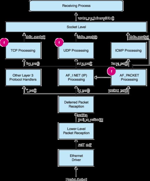 From that moment on, each packet entering the machine and going through the usual receive procedure will be intercepted during net_rx_action() execution and passed to the PF_PACKET receive function.