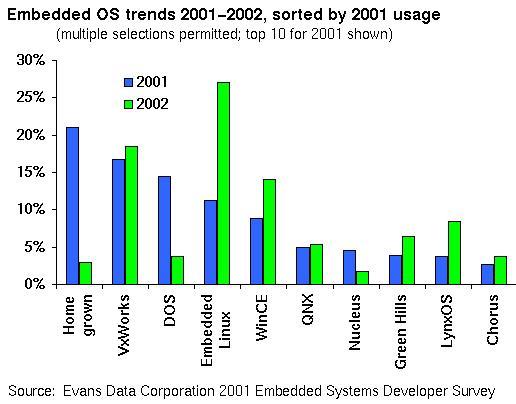 Specifically, Evans Data Corporation's latest data says that embedded Linux was the third-most popular OS choice for new embedded system designs among 500 developers polled in 2001--behind Wind River's VxWorks and Microsoft's DOS, and ahead of Microsoft's WinCE (see Figure 1).