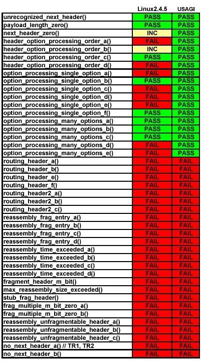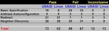 Based on these results, we can see that the USAGI implementation had better results than the Linux kernel implementation; it passed more tests, failed fewer tests and had less inconclusive cases than the Linux kernel implementation.