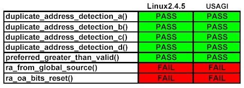 To be able to answer this question objectively, Ericsson Research (Budapest) has performed conformance tests for the latest version of the official Linux kernel (at that time kernel 2.4.5) and the USAGI IPv6 implementation (based on 2.4.0). The tests were based on the University of New Hampshire InterOperability Lab IPv6 Test Description document (see Resources).