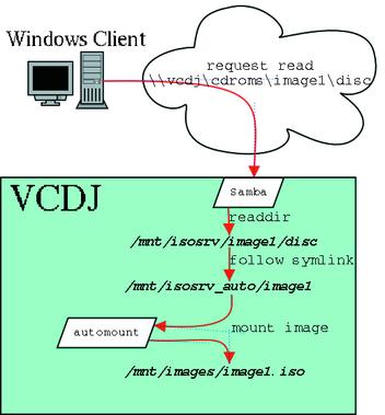 Figure 1 shows a diagram of the order of things when a network client accesses data in the cdroms share. Note that if the client accessed an ISO 9660 image directly, the Samba process would directly read from /mnt/images/, bypassing all symlinks and the automounter.