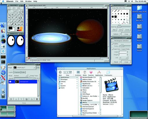 XFree86 and MacGimp with a Mac OS X Finder window open showing the two different window systems operating together.