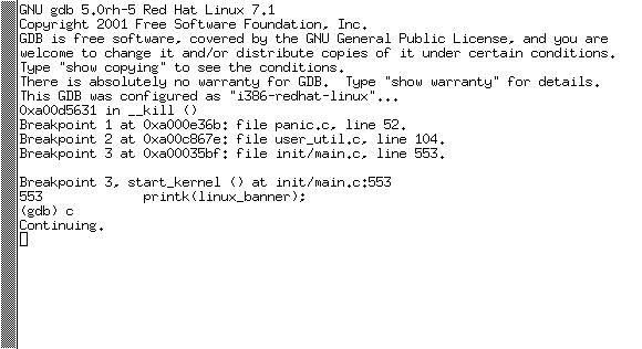 UML makes all that a thing of the past. With UML, you can run the entire virtual machine under GDB, attach to a kernel while it's running, or even after a panic. The easiest way to run UML under GDB is to add the command-line flag debug to your runline. UML will then spawn GDB in an xterm for you and stop the kernel. For most purposes, just type c to allow the kernel to continue booting up (see Figure 1).