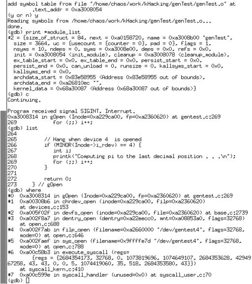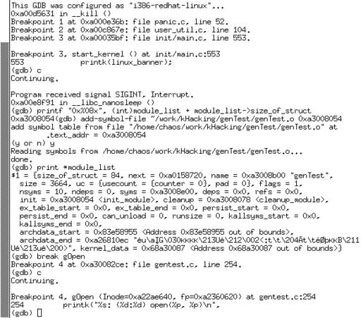 Once the module is loaded, press Ctrl-C inside the GDB window to pause the kernel, and look at the module_list pointer. The last module loaded should be at the head of the list. You can use a simple printf command to get the address of the module. You'll need it when loading the symbol file (see Figure 2).