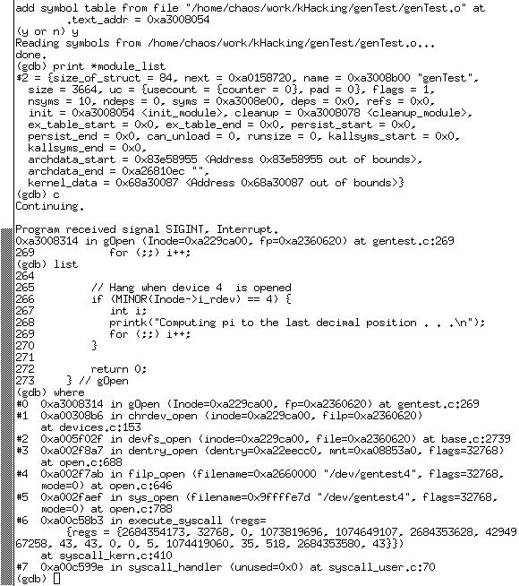 So, let's make a bug—a nasty one. Let's say when someone opens device 4 (cat /dev/gentest4), the module hangs in a nasty loop: for(;;) i++; (see Listing 1). Deadlocks or hangs are common errors when writing programs. They are sometimes hard to find. Typically programmers just use printks to locate the errors: printk("Got here!\n");. This type of debugging works, but you still hang the system several times before you find the problem. With constant fscks, it can get ugly. But, with UML, you just add in the printks and reboot to a fresh filesystem every time to test it.