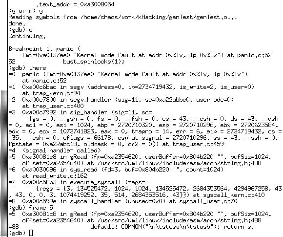 UML will help us find that bug with printks, but it is nothing that would have caused us more than a few reboots. Now let's make our first really nasty bug. Let's say that when someone reads from device 5 (i.e., cat /dev/gentest5); the module starts to overwrite all memory: memset(0, 0, 0xffffffff); (see Listing 2). Overwriting memory is a common error in C programs. In the kernel it is especially nasty and can sometimes cause an instant reboot, keeping you from seeing any printks that are generated. These bugs can still be isolated with printk, but it is a very time-consuming process.