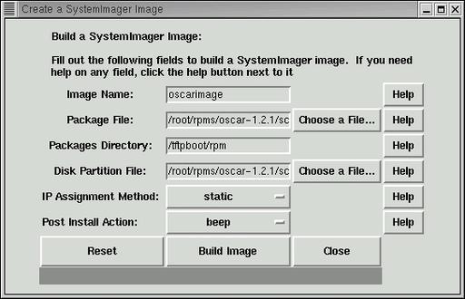 Following the wizard, pressing the Build OSCAR client image button brings up the second panel, the Create a SystemImager Image panel.
