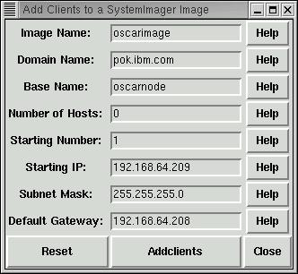 From the Add Clients panel, the user can specify a range of IP addresses to be associated with a list of new clients. Each client is associated with an image name using the Image Name field. One can define a set of clients in a range of IP addresses, each having the same netmask and default gateway. Pressing the Addclients button builds client definitions for SIS. Once complete, it's back to step three on the wizard, Setup Networking.