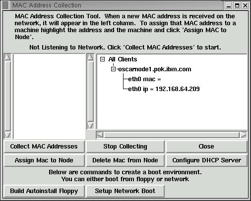 From the Setup Networking panel, MAC addresses are collected for each client in the cluster. If the node is capable of true network (PXE) boot, you simply associate a MAC address with a client, and you're ready to power up the node. If the node is not PXE-enabled, you can write a SystemImager boot diskette from the Build Autoinstall Floppy button. Once the MAC addresses are collected, it's time to press the button to Configure the DHCP Server and boot all the nodes to initiate Linux installation.