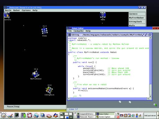 If, like me, you were not entirely satisfied with the outcome of this battle, it is time to get coding and modify your robot. The first time you decide to modify your robot, Robocode will build Jikes, the compiler (it even tells you to go get a cup of coffee). Oui, mes amis, I was asking the same question myself. How old should a programmer be before he or she starts on the real java? For a look at the robot editor and a game in progress, have a look at Figure 1.