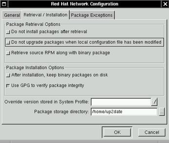 First, if you're going to download, store and distribute updates from a central system as described above, you'll want to select the option “After installation, keep binary packages on disk”, and specify (or at least note) the default value of “Package storage directory:”. If you run rhn_register with the --nox flag, these options are instead labeled keepAfterInstall and storageDir, respectively.