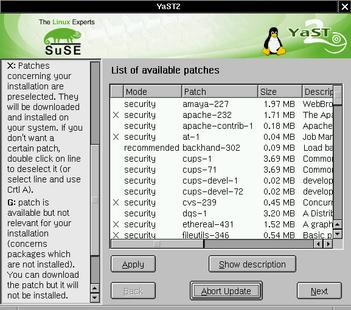 Honestly, there isn't much else I need to tell you about YaST2/on-line update, except for one minor problem I've had with it (an end-user error, actually, but an easy one to make). If you invoke the command yast2 manually from an xterm or a “Run command” dialog and your X session isn't being run as root, the on-line update will fail, returning a misleading error about being unable to locate the update list on the specified FTP server.