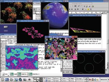forest -geometry 300x200When you are tired of this, try hopalong and experiment with fractal planes. You might also call up julia for some animated julia set fractals. What is that, you ask? Well, according to the documentation, the program “uses ifs {w0 = sqrt(x-c), w1 = -sqrt(x-c)} with random iteration to plot the julia set, and sinusoidally varied parameters for the set, and plots parameters with a circle.” (Aren't you glad you asked?) To round out the xscreensaver offerings for today, consider one of my personal favorites, imsmap. Figure 2 offers a view of my rather busy desktop with many of these programs running simultaneously.