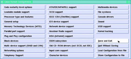 This is all the configuration you need at the kernel level. Next, you should save this configuration and exit by clicking on the Save and Exit button (see Figure 3). This will create a .config file in /usr/src/linux, which is the kernel configuration file. Now you are ready to compile the kernel by following these steps: