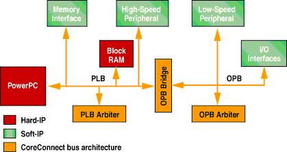 An Xilinx partnership with IBM introduces support for the hard-core PPC405, a robust busing standard and a device fabrication process. Xilinx offers a wide variety of intellectual property (IP) cores for the Virtex-II Pro FPGA, which are predefined hardware blocks that directly snap into IBM's CoreConnect bus technology (Figure 1).