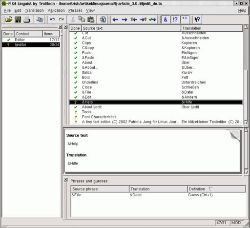 Once you have selected the desired translation language(s) for the application, typing lupdate lj-article.pro creates two XML files that can be loaded into linguist. The translator now translates each string and switches the yellow question mark to a green tick when completed. The task has been fulfilled as soon as the Scope window (on the left-hand side of Figure 2) reveals that all of the classes have been translated fully.