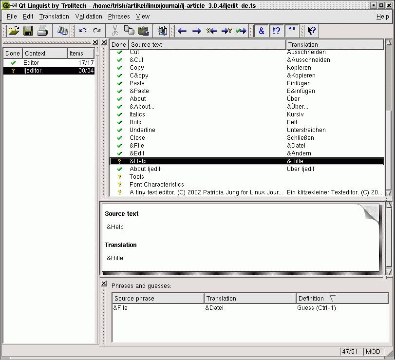 When the last translated phrase is saved, File®Release... compiles the translations into a *.qm binary file that can be used by the program. To release an entire set of translated *.ts files, lrelease lj-article.pro can be used instead. If the code is changed afterward, a fresh lupdate run integrates the relevant changes with the *.ts files listed in the project file, and lrelease updates the binary version.