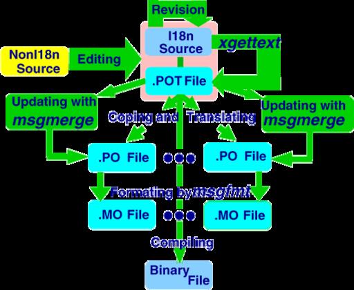 • Create a ll.mo file with the msgfmt program (mo stands for machine object). Sometimes you can see gmo files (g stands for GNU).