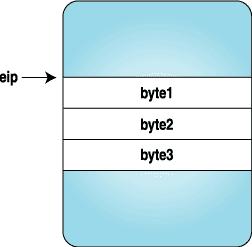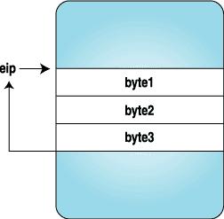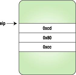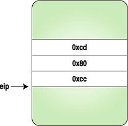 Here we replace the three bytes with the code for a trap instruction, and when the process stops, we replace the original instructions and reset the eip to original location. Figures 1-4 clarify how the instruction stream looks when above program is executed.
