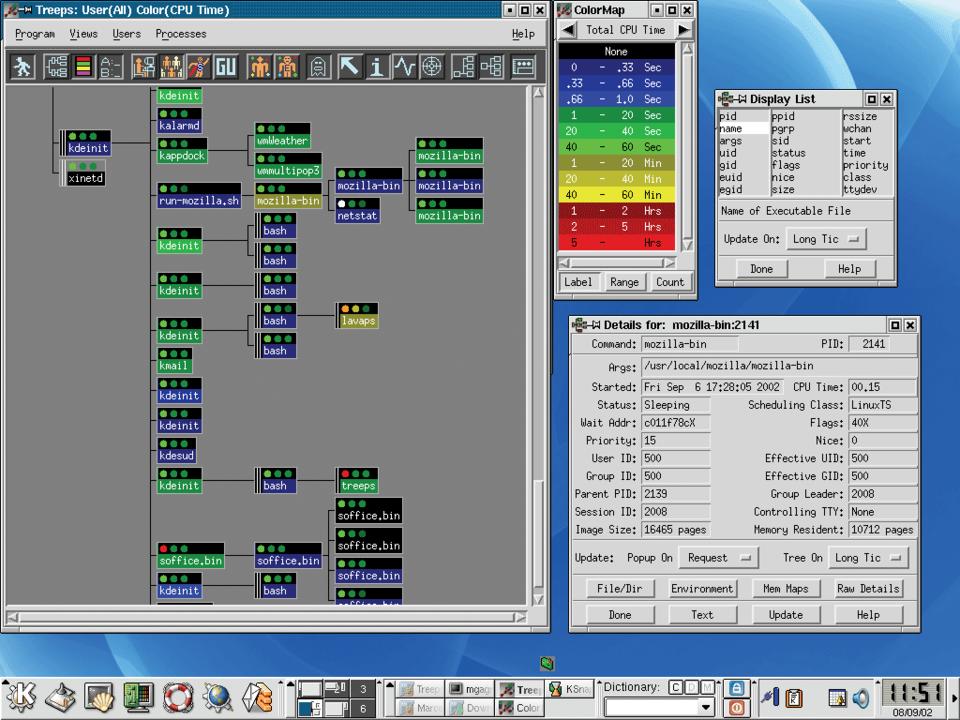 The features are numerous to say the least, but the color-coding is what really caught my eye. While the program is running, turn on the “color map viewer” by clicking on the color-bar button. By cycling through the various options, you can highlight processes based on user ID, group ID, total CPU time, current CPU load, process status (sleeping, running, zombie, etc.), resident memory, image size and more.
