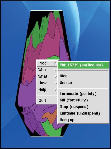 To start your lava lamp, type lavaps &. You'll see a small lava lamp appear on your desktop. Right-click, and a menu pops up offering a number of options. The proc menu tells you the process ID and the name of the process. It also allows you to send various signals (such as kill) to the process, from forceful termination to temporary suspension.