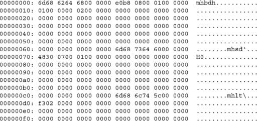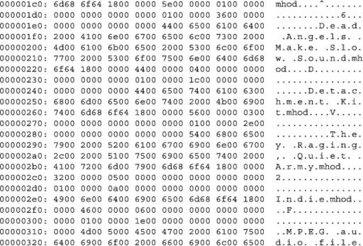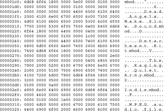 Although every file format contains repeated patterns, the trick is recognizing these patterns and learning how to parse them. Opening a file in a hex editor allows us to examine the raw data for patterns. Figure 1 contains the first 256 bytes of an iTunesDB file as shown by Emacs in hexl-mode. The first column is the file position; then there are eight columns, each column containing two bytes. The final column is the ever-helpful ASCII representation of the data.