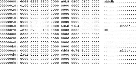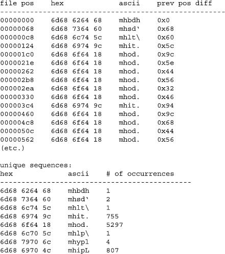From only the first 256 bytes, a pattern emerges: three 5-byte sequences start with “mh” (0x6d68). When we scan the rest of the file, we find it littered with 5-byte mh sequences (see Figure 2). Based on the number of mh byte sequences we see in the file, we hypothesize that these sequences are a marker for a data structure. We don't know if the data structure has a fixed or varying size. Perhaps it is only five bytes long and the information between the mh sequences is composed of other data structures. To help us determine this information, we will extract the first 15 mh sequences from the file (Figure 3).