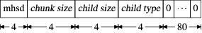 Going down the tree one level from mhbd, we have a pair of mhsd nodes, each 104 bytes long. Breaking the data after the initial 12 bytes into 4-byte numbers shows us that only the first 4-byte number contains any non-null data. It equals one when the child node is mhlt and two when the child node is mhlp. Figure 10 contains a description of the mhsd chunk.