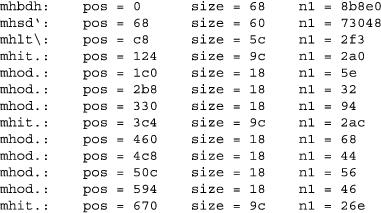 Our first validation program will display information (shown in Figure 4) about all the mh chunks in the file to help us find patterns. The first glaring pattern we see pertains to the difference between the file positions of the mh chunks. With the exception of the mhod chunks, the fifth byte contains the number of bytes until the next mh chunk. We can add code to our validation program to check this pattern, and we find that this is almost the case: there are a few chunks besides the mhod chunks that fail our test. It is unlikely that the creators of the iTunesDB file format would limit the size of a data structure to 256 bytes, thus we are probably dealing with a multibyte number.