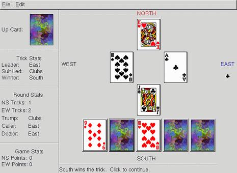 If you like Euchre, this is a nice version of the game. The AI players have three configurable levels of play, and the author includes instructions for those unfamiliar with the game. Play is fast and easy. Requires: libgtk, libgdk, libgmodule, libglib, libdl, libXi, libXext, libX11, libstdc++, libm and glibc.