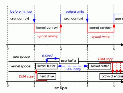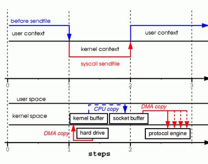 Looks simple enough; you would think there is not much overhead with only those two system calls. In reality, this couldn't be further from the truth. Behind those two calls, the data has been copied at least four times, and almost as many user/kernel context switches have been performed. (Actually this process is much more complicated, but I wanted to keep it simple). To get a better idea of the process involved, take a look at Figure 1. The top side shows context switches, and the bottom side shows copy operations.