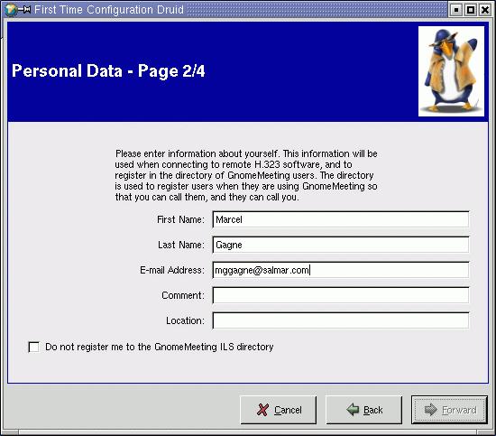 When starting GnomeMeeting for the first time, you'll be presented with the First Time Configuration Druid. Part of this process involves registering with the directory of GnomeMeeting users—think of it as a large on-line telephone directory. You can opt not to be listed by clicking the check box at the bottom of the Druid's registration box. When you are happy with the information you are presenting, click the Forward button to continue, and you will be asked to specify the connection type you are using.